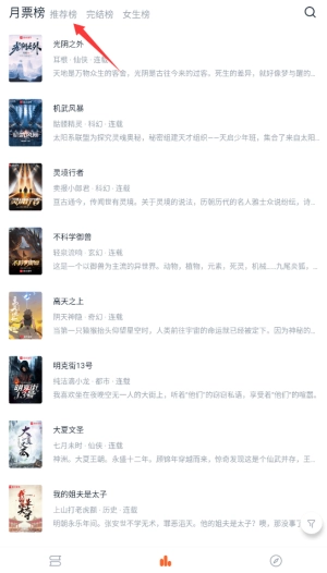 1、进入桔子小说APP后,在首页导航栏选择"推荐榜"栏目,这里展示编辑精选的热门作品。