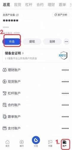 1、在芝麻交易所app登录账号,然后点击主页中的“充值”,或者点击“资产”-“充值”。