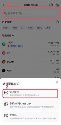 2. 输入需要提币的币种,接着选择“链上提币”。在此,我们以提币USDT作为示例。