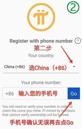 第二步:选择中国,并输入您的手机号码,点击“GO”。