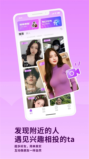 将可能喜欢的异性用户推荐到首页中,可以根据推荐成员找到感兴趣的人进行交友聊天;