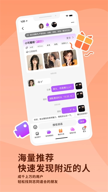 用户可以与异性通过线上进行文字和语音聊天,可以随时发送信息给喜欢的异性查看;