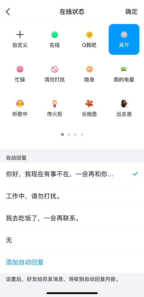 5、点击“离开”选项,随后会看到下方出现自动回复的可选项目,你可按需自主挑选。