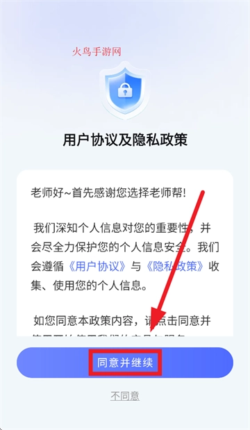 下载安装并打开老师帮app,在用户协议及隐私政策点击同意并继续
