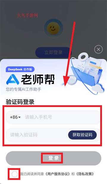 输入手机号,验证码,勾选我已阅读并同意 《用户服务协议》和《隐私政策》,点击登录即可