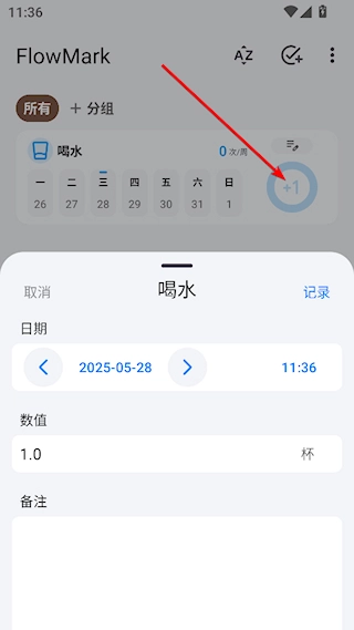 5.在习惯列表中,点击习惯右侧的+1,添加打卡记录