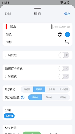 4. 对习惯内容进行设置,例如提醒、分组等操作,全部设置完成后,点击“保存”,至此完成整个设置流程。