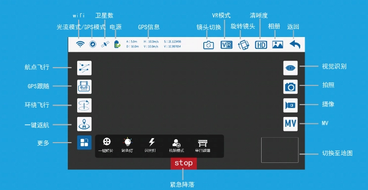 1. 具备一键起飞、降落以及无人机翻滚等功能,同时能够借助遥控器对无人机油门和方向进行操控。