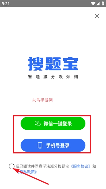 第一步,打开学法减分搜题宝app,接着阅读并同意“服务协议和隐私政策”。