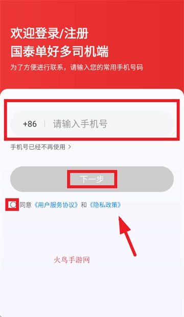 当您进入登录界面,在相应位置输入手机号,同时勾选“同意《用户服务协议》”以及“《隐私政策》”,完成后点击“下一步” 。