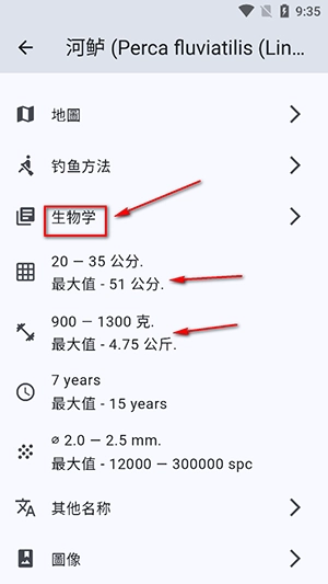 4、你还能点击【生物学】,查看百科知识,从中了解鱼的长短、重量等信息。