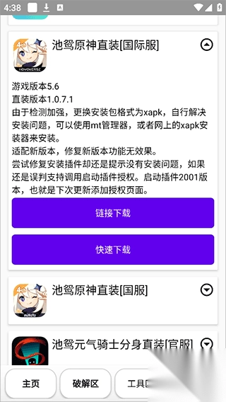 池鸳推出的最新版启动插件,是一款专门针对《原神》《鸣潮》《元气骑士》《火影忍者》《迷你世界》等诸多热门游戏匠心打造的手机辅助工具。通过该软件,对应游戏的用户不但能够完成游戏私服搭建、参数调整等动作,还可以开展游戏直装、插件扩展以及资源同步等一系列行为,以此极大增强游戏过程中的便捷程度与趣味体验。