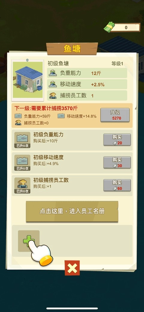 3、工作分配也离不开鱼塘小屋。点击进入鱼塘小屋,在此处,你不仅能够查看详细的小屋信息,还能在鱼塘底部的“+”处,安排员工上岗。