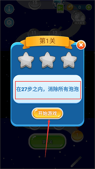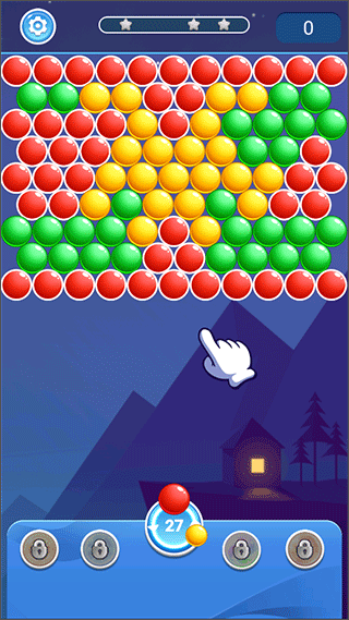 3、进入关卡后,点击屏幕即可发射泡泡,击中相同颜色的泡泡且数量大于3即可消除;
