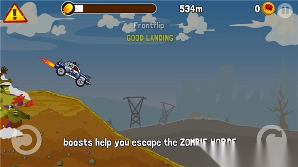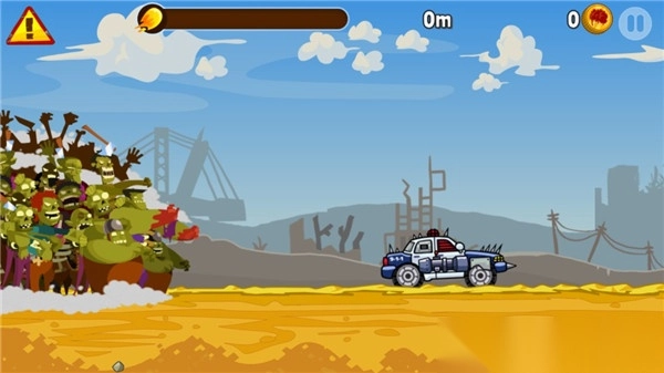 在游戏里,玩家将驾驶爱车,驰骋在危机四伏的公路上。后方有大批僵尸穷追不舍,前方又不断有僵尸突然冒出。玩家需借助各种特性技能来消灭僵尸。它的操作十分简便,轻点屏幕就能控制前进后退,必要时还能秀一把特技空翻。不过,空翻时机得把握好,不然很容易酿成车毁人亡的悲剧。