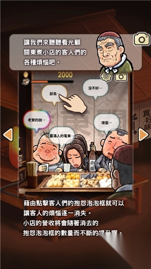 1、游戏模式我们通过点击客人的抱怨可以让客人的烦恼而让这些烦恼消失,从而增加我们的收入,烦恼分为多种多样,有恋爱、社会、自己、工作、家庭等等,仿佛我们在这个小小的关东煮店里看到了整个社会看到了我们自己,但是我们的烦恼并不会像是游戏一样这么简单的就消失,还是需要我们自己去努力。