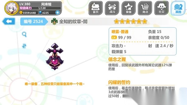 3、祈愿装、全知的纹章闇(暴击纹、纹章)、获取难度高。需要偶像化,暴击系列扛把子,不可或缺的暴击辅助。一技能回弹忽略不计,爆伤翻倍,持续时间长达20秒。相对于其他武器,增加的攻击力算中等。仍然有被替代的可能,日常用不到(没加移速都是弟弟)。攻坚时上的顶配,暴击被针对将彻底完蛋。但它从始至今依然屹立不倒,伤害喷雾的顶梁柱之一。