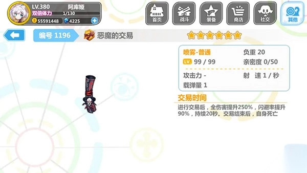 6、活动地图装备“恶魔的交易(交易)”,获取难度中等。使用该装备后,能立刻提升250%的伤害,同时闪避也会提升90% 。不过它存在一个致命缺点,使用20秒后角色会当场死亡。在一些需要攻坚且拼速度的地图中(复活流玩法适用的图),这件装备可以发挥作用。然而目前它遭到了针对,在大部分活动里,角色复活就会扣除相应积分。所以遇到这件装备时,可以留一个作为备用。