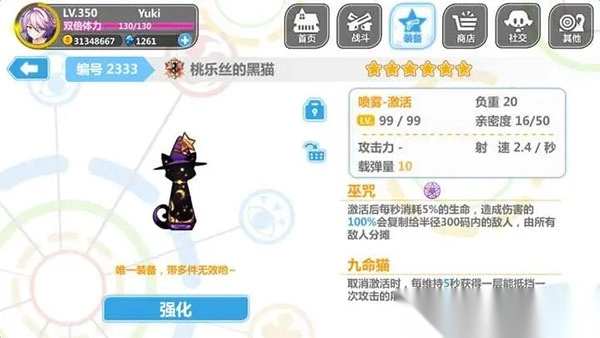 10、全神限定、桃月丝的黑猫(黑猫、桃乐思)、获取难度极高。激活每秒消耗5%生命值,造成伤害100%分摊给300码内所有僵尸娘。取消激活可获得护盾,维持5秒一层,最高9层,维持10秒。顶尖的神器,相当于每秒对300码范围内进行一次收割,配合礼服割草口味极佳。攻坚也同样给力。推荐入手。