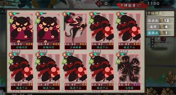 折扇:抓取关键卡牌。经多次试验发现,屠龙刀过于精简,会致使战斗进入多回合;落日弓虽能提升面板,但实际必要性不大,毕竟卡组自身就能提供大量攻击。此阵容只需凭借“太极拳 - 固有”“空明拳 - 固有”“少林醉拳 - 固有”,便可顺利展开。
