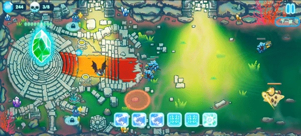 3、小兵出现就直接放地上,束缚随机应变,最好是给巨人,这关最恶心的其实是那个巨大史莱姆,他吐出来的小史莱姆会跳过防线,直接跑到水晶面前,如果你放技能打,那就完全是浪费技能,很可能导致后面没技能用,所以我一般都是直接秒。