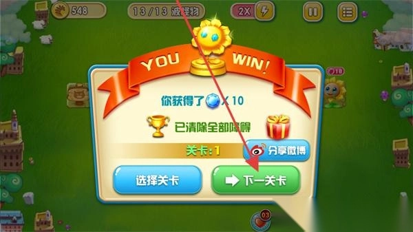 3、在胜利结算界面,会展示“YOU WIN!”字样。此时,所有障碍都已被成功清除,意味着玩家获得了关卡1的胜利。玩家可领取10颗钻石,若选择“下一关”,便能继续游戏。