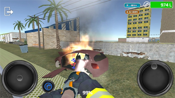 5、点击下方开启水龙头的小按钮,水枪便会开始放水,此时需借助摇杆控制方向,对准着火点实施灭火操作。