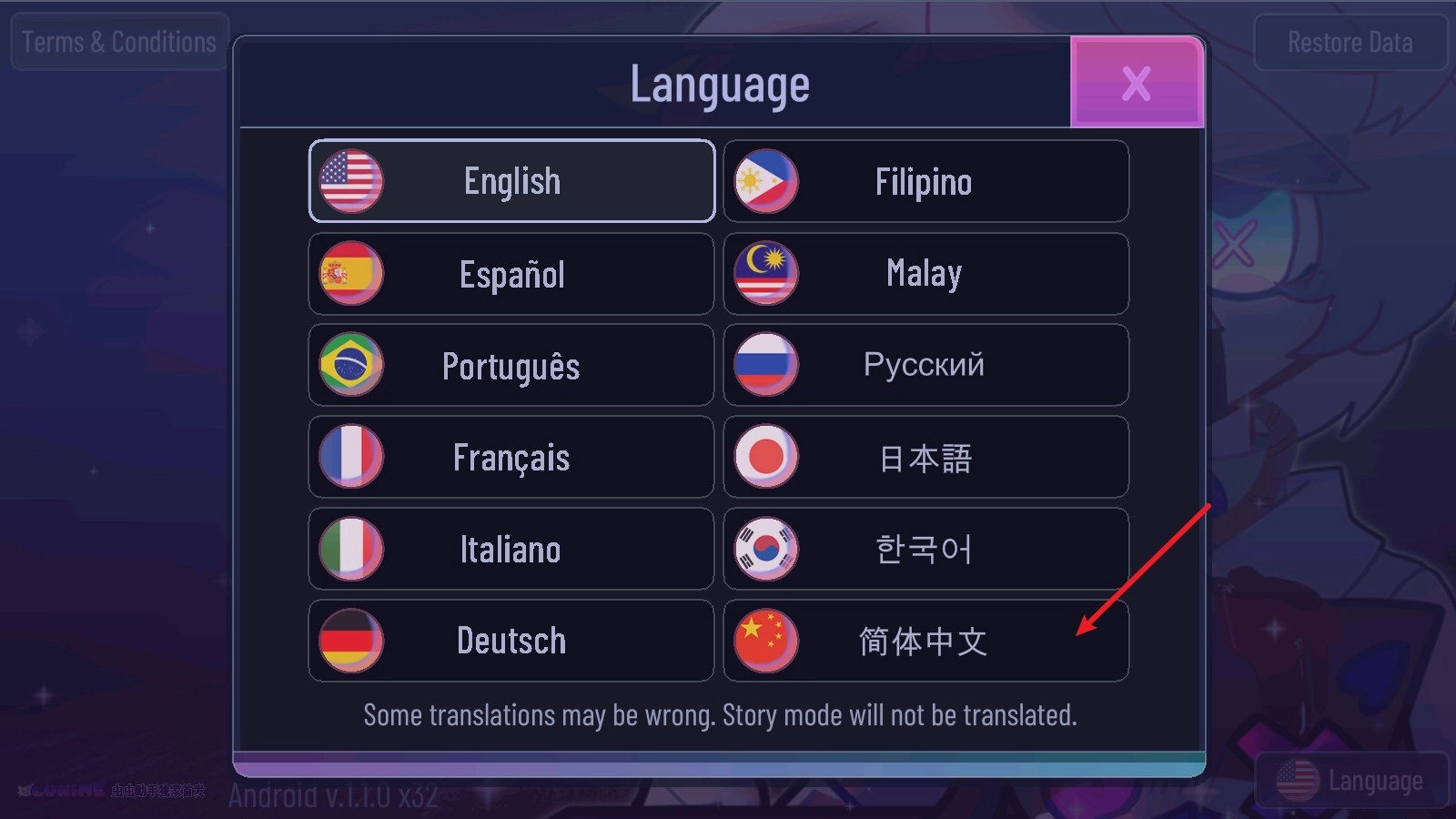 1、在进入游戏之前,于主界面的右下角位置,我们点击“language” 。