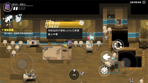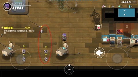 4、当我们拾取武器之后,游戏界面右侧的圆盘即可派上用场了,点击可以发射子弹攻击,滑动可以调整攻击方向。