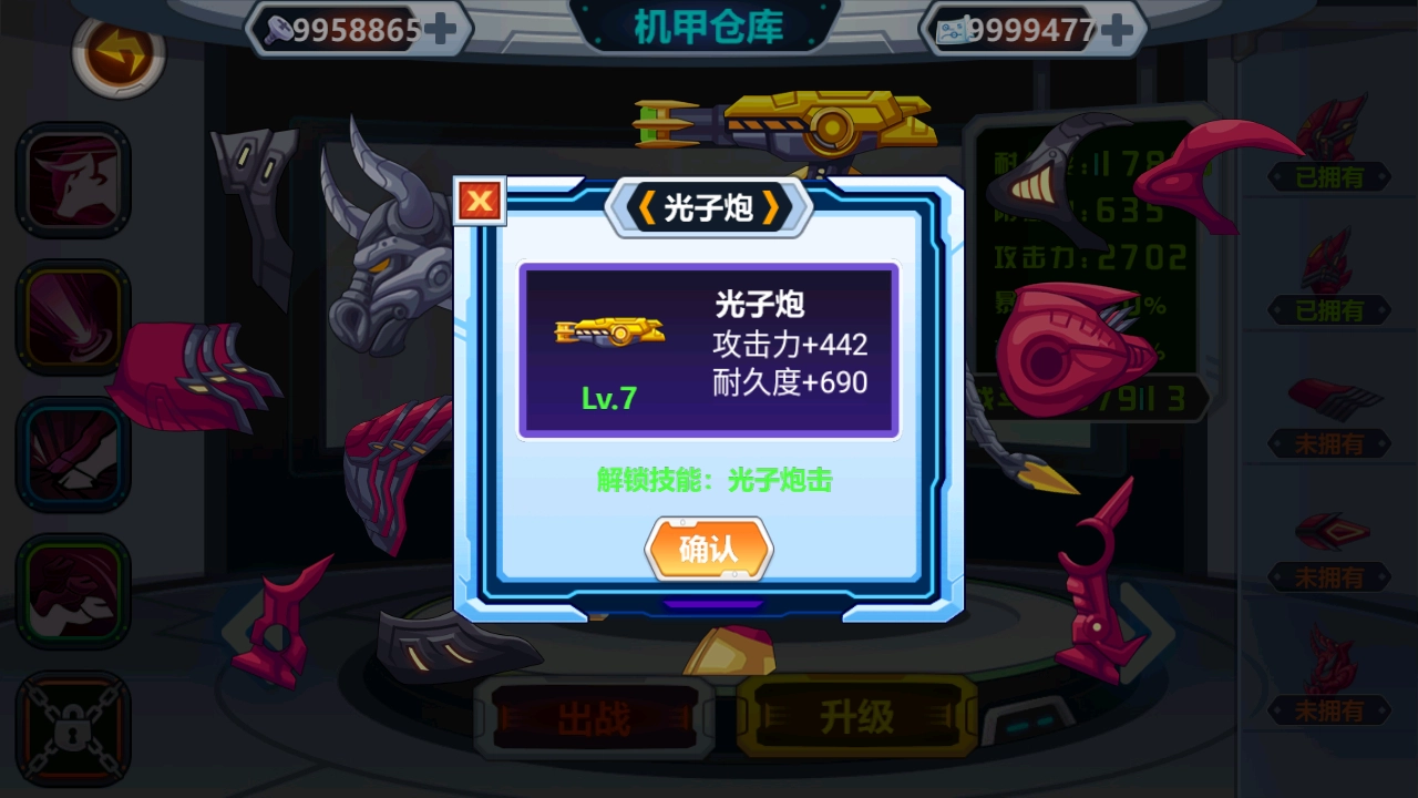 2、零件与图纸是游戏内的货币,可用来购买解锁猛兽以及购买升级机甲装备。虽然其升级消耗速度较快,但不必担忧,游戏中设有9999999的零件与图纸,而且无需观看广告就能获取奖励。