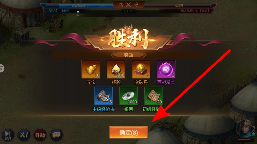 2、战斗胜利后,紧接着会弹出胜利界面,界面上展示着元宝、经验、突破丹等各类胜利奖励。此时,只需点击确定按钮,就能领取这些奖励,从而助力角色与部队成长。