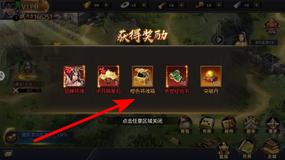 4、当完成特定任务或关卡后,将会弹出奖励界面,界面上会展示貂蝉将魂、闭月扇星石、橙色将魂箱等珍稀奖励。只需点击界面的任意区域,即可关闭该界面。而这些奖励能够在很大程度上提升角色的战力。