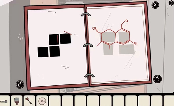 3、你能够拉开显微镜桌子上的抽屉,抽屉里放着一个手电筒和一片透明片,透明片上有一个化学公式。你会发现公式里的红线与笔记本中黑色方块上的线条是一样的。