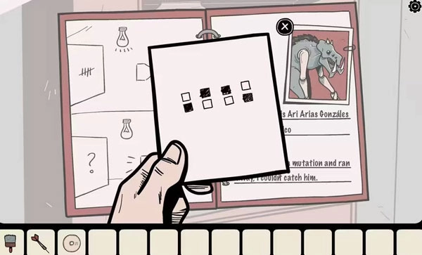 2、往右边移动,你会瞧见一个衣柜,上面附着着一些让人觉得恶心的东西,旁边还有一扇锁住的牢房门。继续朝右移动,你会发现一个实验台,墙上挂着不少照片,这些照片的排列方式和笔记本里黑色方块的排列方式一致,而且每张照片上都有一个奇怪的符号。