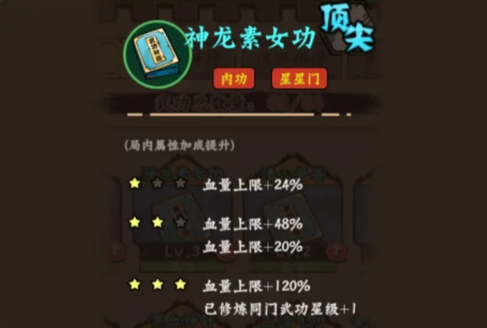 搭配原理:前期,羁绊属性主要集中于少林派增加血量上限,以及昆仑派按百分比回血,以此确保自身血线稳定。同时,借助拳掌攻击伤害加深的特性来实现输出。中期,获取蓝色神通“神龙素女功”后,优先将其提升至3星,此时流派便宣告大成。本阵容依靠少林派与内功所带来的高额血上限,以及“3星内功”使所有已学习的同门派武功星级 +1 的效果,进而取得胜利。