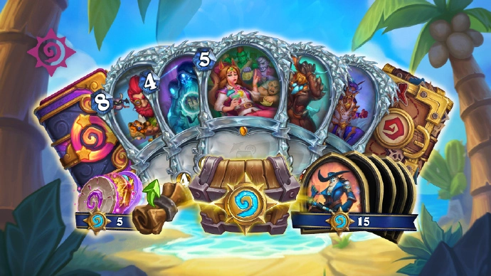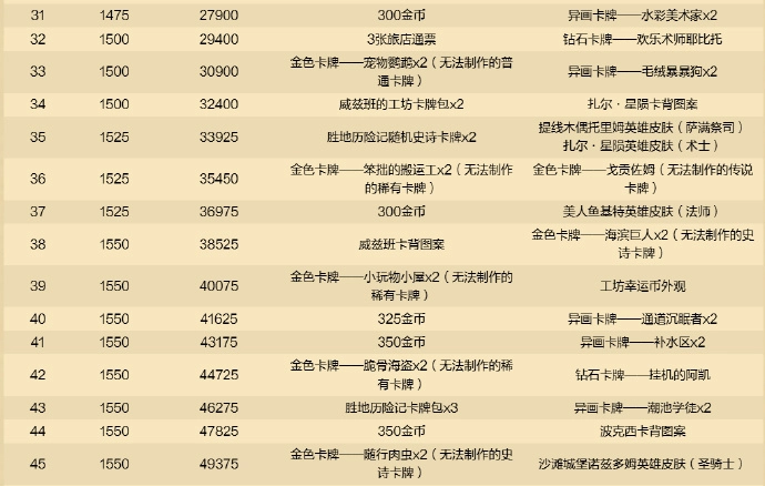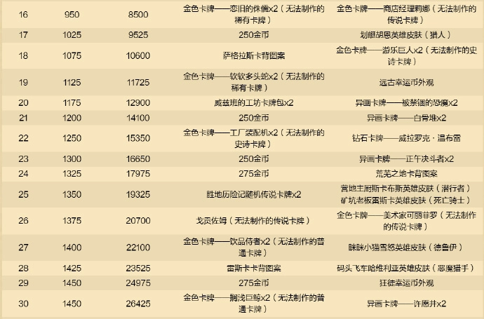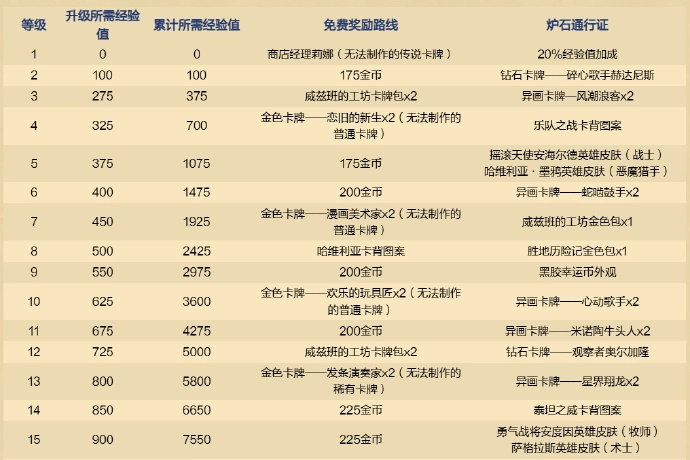 免费路线里总共涵盖2张传说卡牌、8包威兹班的工坊卡牌包、3包胜地历险记卡牌包、2张胜地历险记随机史诗卡牌、2张胜地历险记随机传说卡牌、5款卡牌背面图案、3张旅店通票、28张源自国服玩家错过的炉石通行证里的金色卡牌,还有金币。