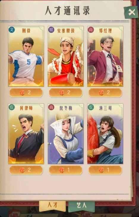 在具备上述珍贵品质的人才里,【人才-郑经理】、【人才-安塞腰鼓】以及【人才-刚毅】所关联的羁绊艺人相对比较容易获取。特别是【郑经理】,与之相关的艺人不仅数量可观,而且获取的门槛不高。所以,对于我们0氪和微氪的老板而言,在前期发展阶段,【郑经理】可作为首选。