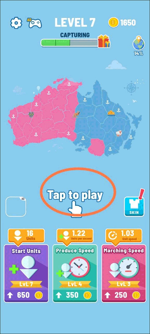 进入游戏后,点击即可看到一个很大的地图,屏幕正中间有一句话“tap to play” ,点击它游戏便开始。这句话下方有三项内容,分别是部队的生成时间、速度以及数量,后续可通过花费金币升级的方式来强化这三项能力。