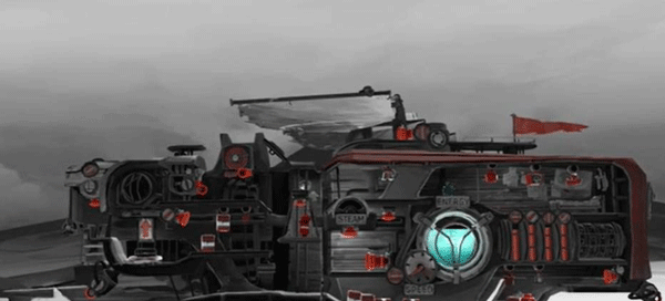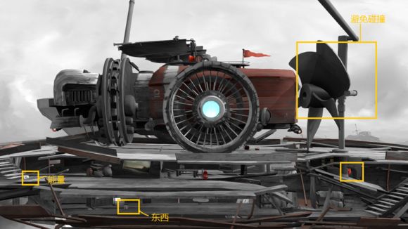 图中以高亮显示的是机关,其颜色为橙红色,所有图中的机关均是此色。鉴于人仅能操控前后移动以及跳跃动作,因此操作按钮大致为顶、踩、推这几类。能量液用于驱动后方的房车(帆车)。之所以不将能量液直接称作燃料,是因为它后续还能用于灭火,若叫燃料会稍显不协调。