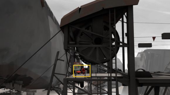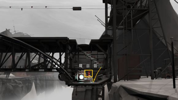 6、难度基本可以忽略不计,下车后径直往前走,走到桥的另一头,在这儿把油桶放置到箭头所指的位置,接着按下开关就完成了。