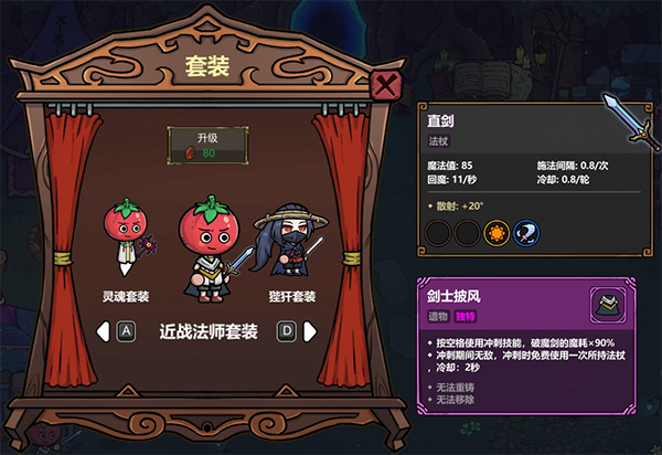 2. 近战法师套装所自带的法杖为「直剑」,自带的法术增强是「范围增强」,法术飞弹为「破魔剑」。此外,还会配备一个独特遗物「剑士披风」,此遗物既不能重铸,也无法移除。