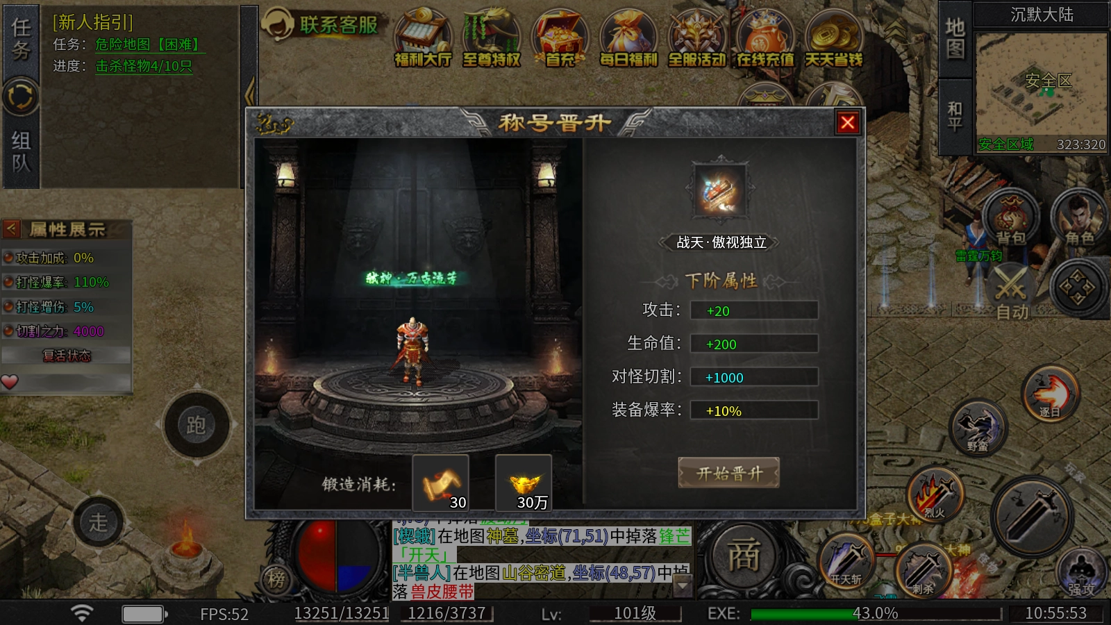 称号晋升规则如下:晋升过程需消耗封号凭证与元宝,其中封号凭证可通过击杀怪物获取。每次成功提升称号,角色都将获得切割伤害与物品爆率方面的属性增强。