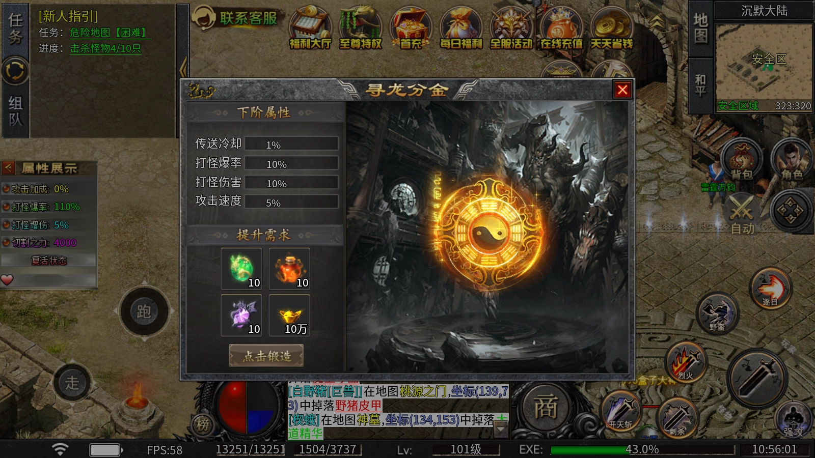 寻龙分金玩法规则如下:提升时需消耗巨龙内丹、盘古血、龙石与元宝这几种道具,成功提升后,玩家可获得传送冷却缩短、打怪爆率增加、打怪伤害提升以及攻击速度加快等极品属性加成。