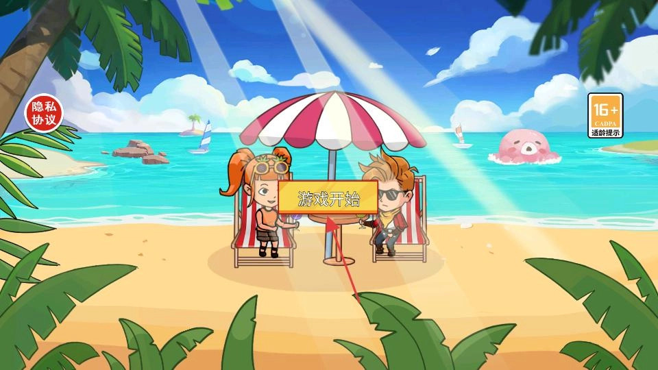 进入游戏初始界面后,映入眼帘的是海滩场景和游戏开始按钮,按照红色箭头的指引点击这个按钮,就能触发模式选择界面的加载,为挑选玩法做好准备。