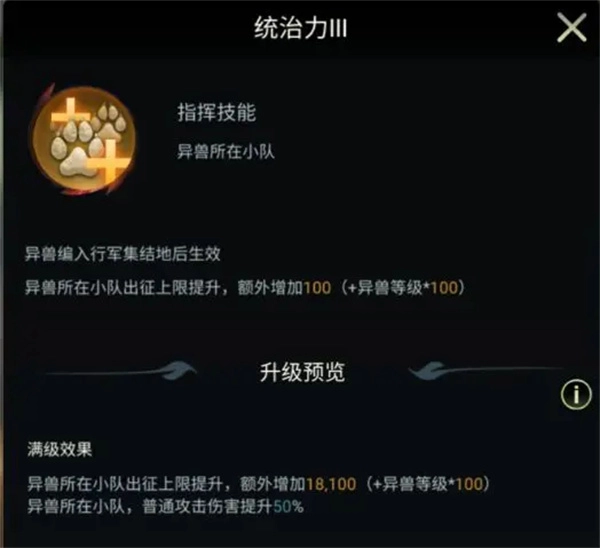 每个异兽的技能都各有差异,一般而言,金色战斗型异兽建议优先培养第一个技能,该技能能够增加其带领的战斗小队中的野兽数量,从而有效提升部队的整体战斗力。
