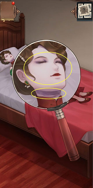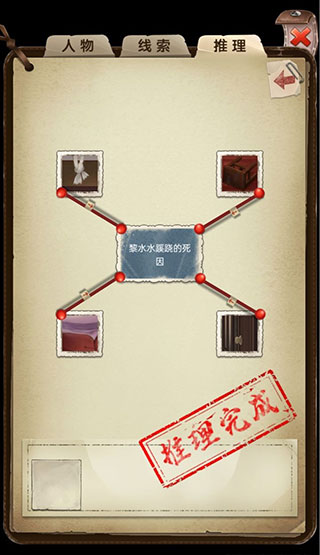 选择:悬梁的白绫、一匹白绫、红色旗袍、一双红绣鞋、锁着的窗户、死者的妆容、房梁上的黑手印、黎水水脖颈上的勒痕以及被踩倒的方凳。