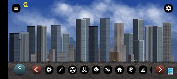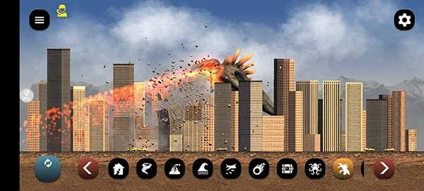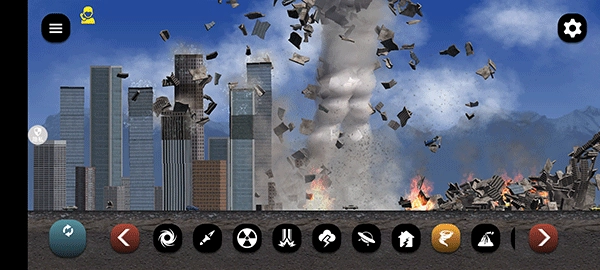游戏启动后,映入眼帘的是以城市为背景的地图界面,我们能够自由切换不同场景,界面下方排列着的是各类灾难模拟功能。