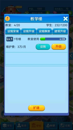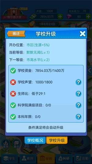 高校建设过程中,要时常关注升级所需的条件,别光顾着操作其他功能而把这件事抛在脑后。奖学金方面,一等奖设为1%、二等奖3%、三等奖5%,合理设置奖学金能有效调动学生的积极性,要是把这些百分比都调至上限,反而会削弱学生的动力。学校活动的重要性不言而喻,要是第一年没开启这个功能,很容易就会被其他学校拉开差距。开启后直接选四个活动开展,当活动举办到一定次数时就能获得声望,从而让学校升级的速度更快。