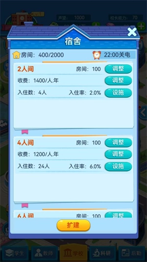 宿舍楼是收益不算高的建筑,但对提升现代化分数来说挺关键的。建议有钱的时候就扩建,设施最好全升到满级,这样加的现代化分很高(前提是有钱,别搞到破产)。往下滑动还能看到六人间和八人间的选项。关于各房型的数量调整:未扩建时,2、4、6、8人间各设250间;第一次扩建后,每种房型各调为1000间;第二次扩建后各1750间;第三次扩建后各2500间。入住率和设施等级、收费标准有关。