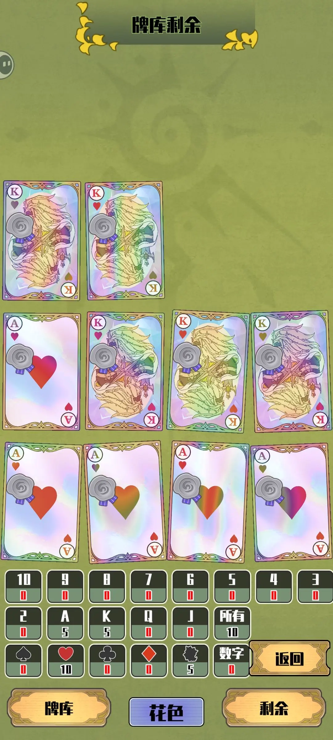 手牌(共10张):5张红桃宝石回响辐射卡(优先选择A卡或人头卡),以及5张珍珠回响辐射卡。